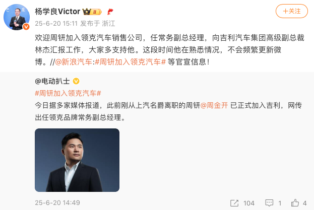 6月20日,浙江吉利控股集团高级副总裁杨学良宣布,周钘正式加入领克汽车销售公司,任常务副总经理,向吉利汽车集团高级副总裁林杰汇报工作。