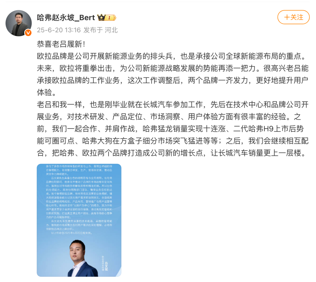 6月20日,长城汽车宣布,根据公司发展需要,吕文斌接替赵永坡担任欧拉品牌总经理,主责欧拉品牌全面管理工作。