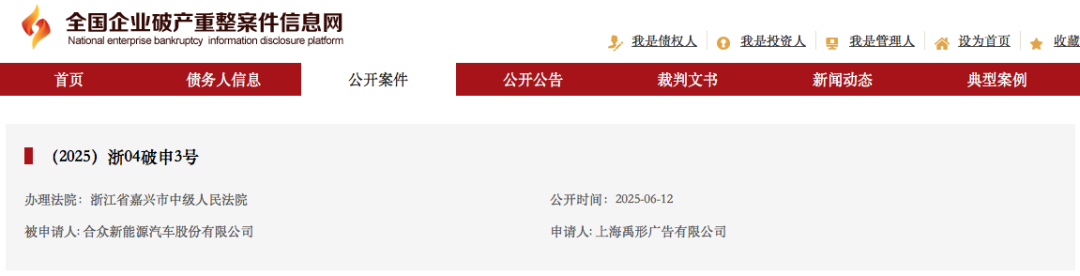 6月19日,全国企业破产重整案件信息网显示,哪吒汽车母公司合众新能源汽车股份有限公司新增(2025)浙04破3号案件。