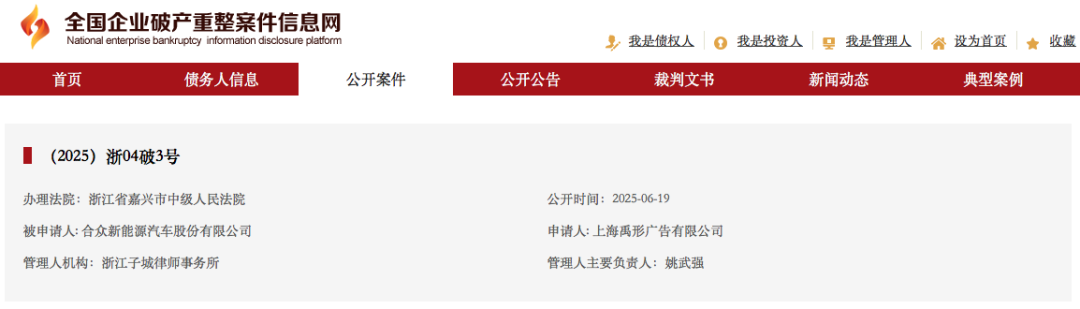公告显示,申请人为上海禹形广告有限公司,被申请人为合众新能源汽车股份有限公司,经办法院为浙江省嘉兴市中级人民法院,管理人机构为浙江子城律师事务所,管理人主要负责人为姚武强。