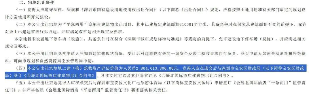 其出让公告中也提及,该出让宗地为“平急两用”设施带建筑物出让项目,具备条件时在保障总建筑面积不变的前提下,允许对地上已建建筑进行拆改建,并应满足改扩建相关规定及要求。宗地竞得人应在成交后与深圳市宝安区文化广电旅游体育局申请签订《会展北国际酒店“平急两用”监管责任书》,并严格按照《会展北国际酒店“平急两用”监管责任书》要求落实相关责任。